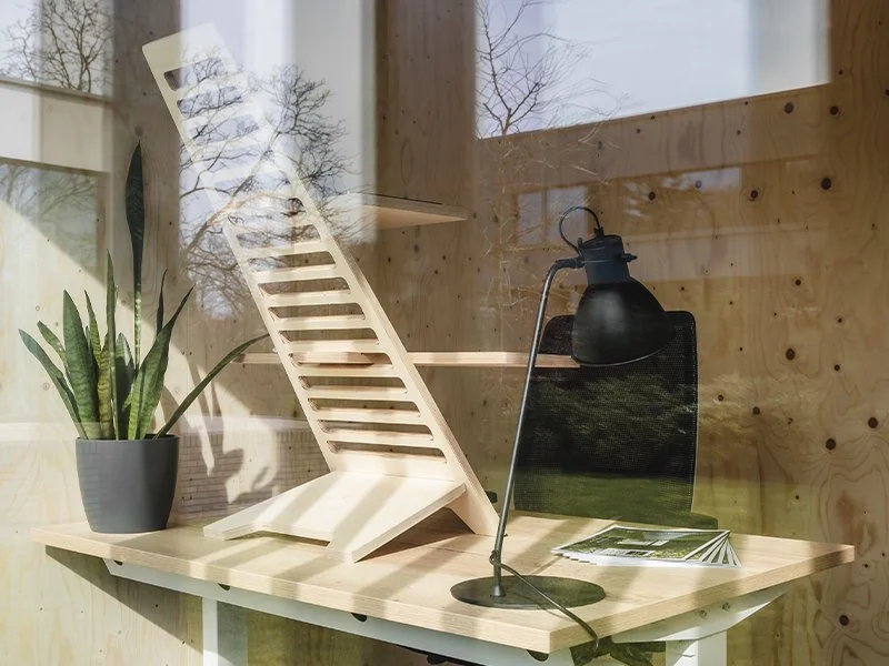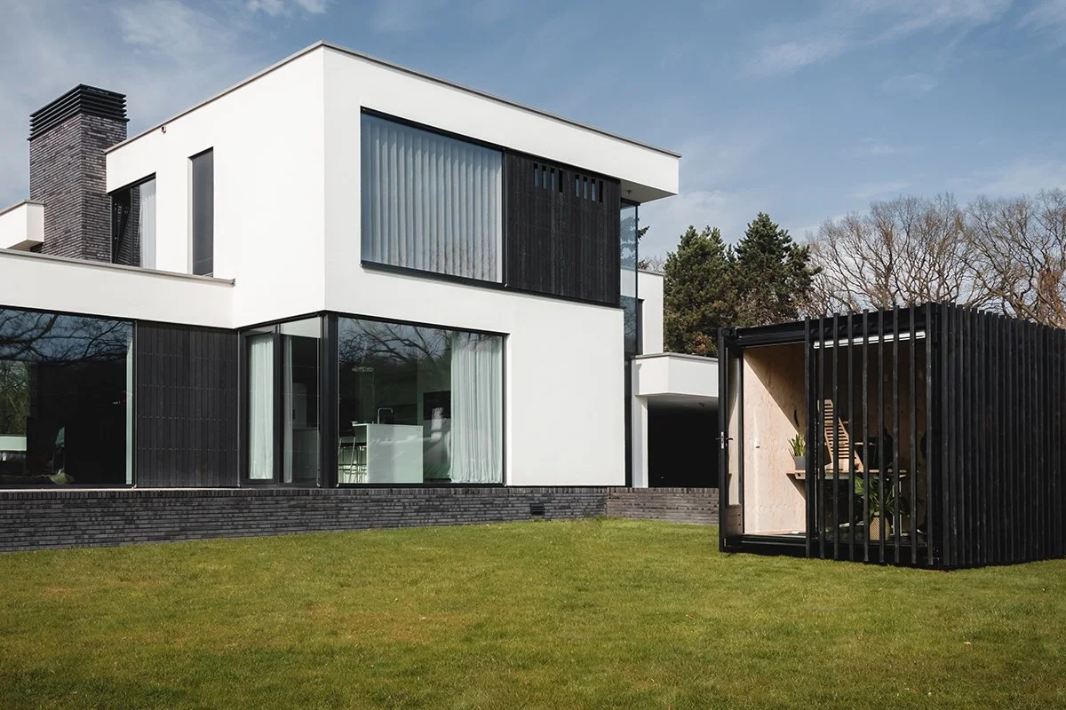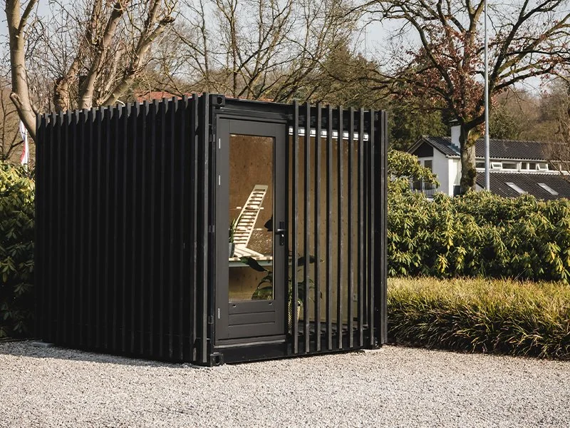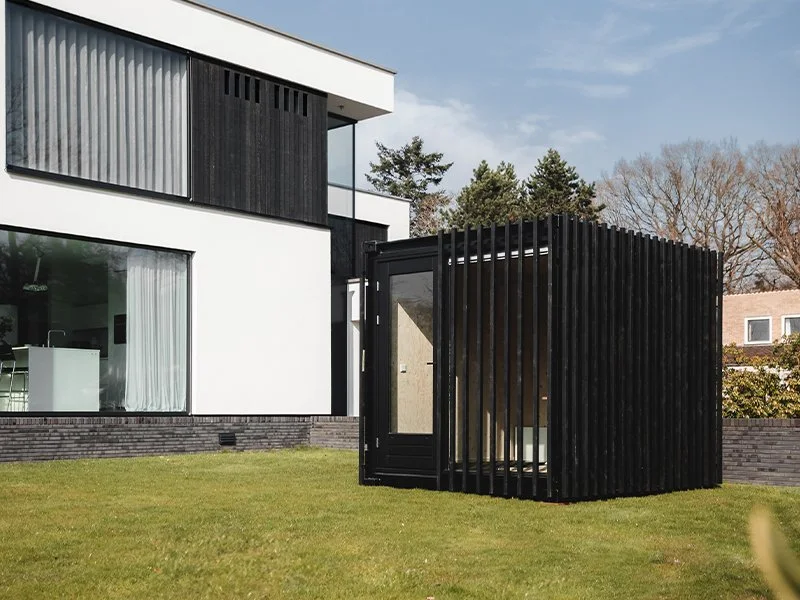 Deze basis is voorzien van een underlayment-afwerking aan de wanden en standaard zwarte tapijt op de vloer, zonder verdere faciliteiten. Dit biedt volledige vrijheid voor persoonlijke invulling. Als er specifieke wensen zijn voor de afwerking en/of faciliteiten, zoals een keukenblok of verwarming, kunnen wij de kantooruimte volledig aanpassen naar jouw wensen.