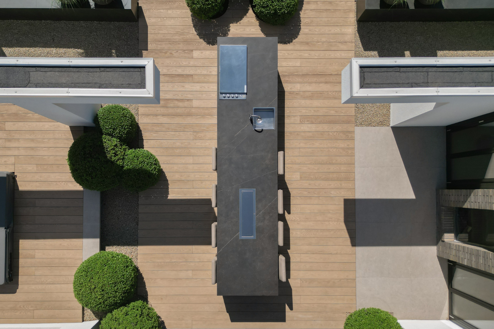 Met een lengte van 5 meter en een diepte van 1,2 meter is deze keuken royaal opgezet. Het ontwerp is ontstaan in samenwerking met Mint Interieur, die het lijnenspel van binnen heeft doorgetrokken naar buiten. In het tuinontwerp van Tim Exclusive Gardens is de keuken subtiel geïntegreerd, maar blijft deze duidelijk aanwezig.