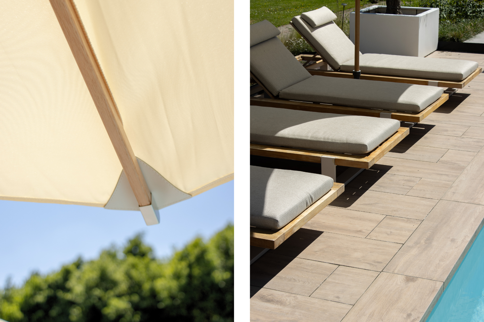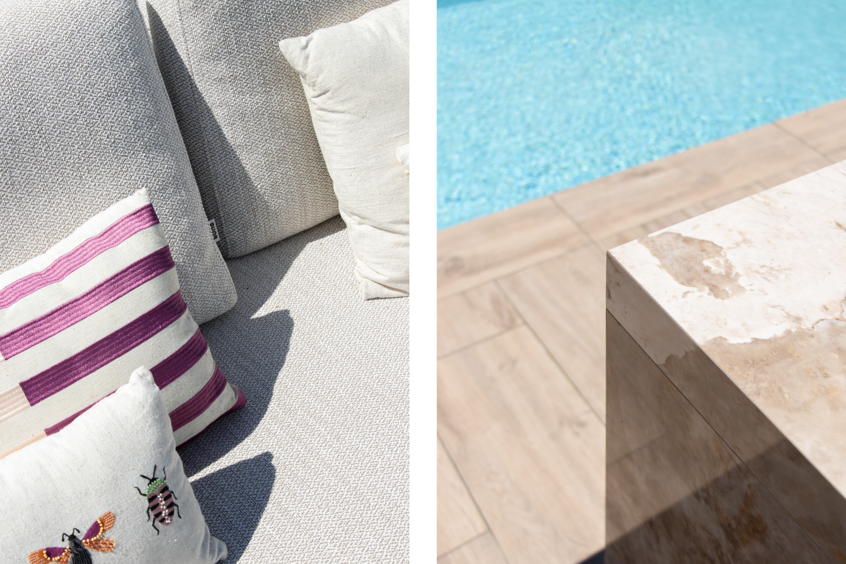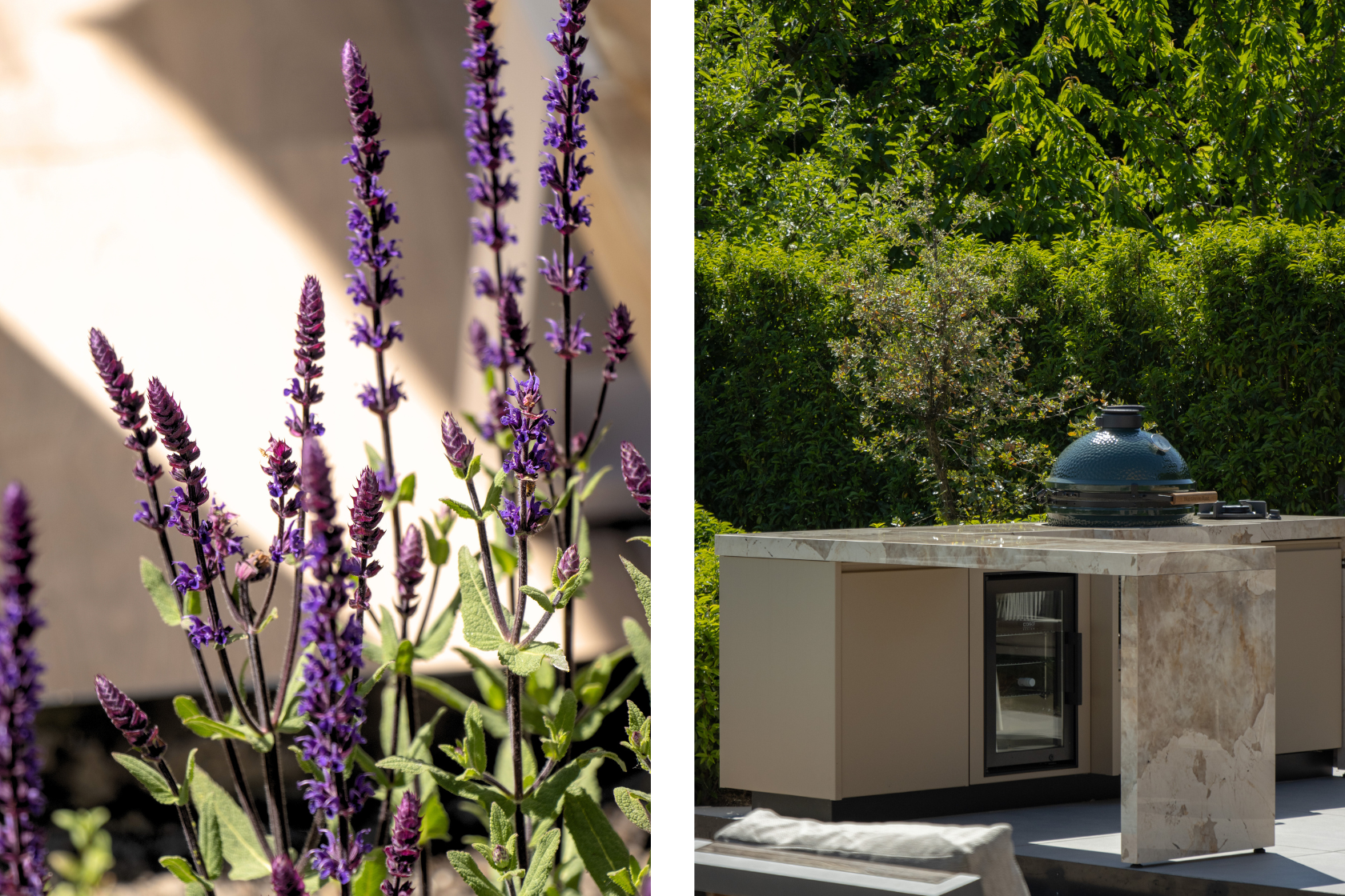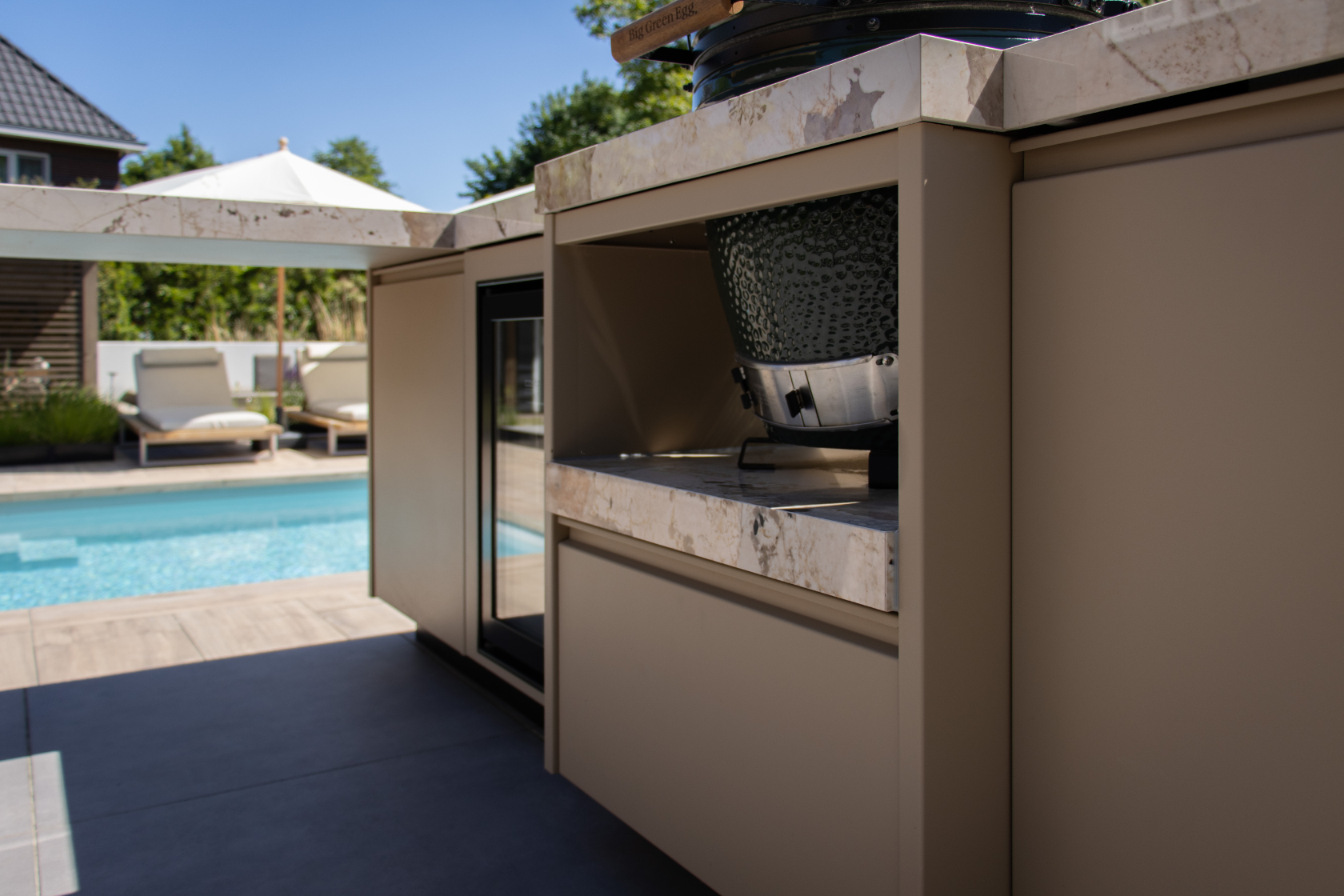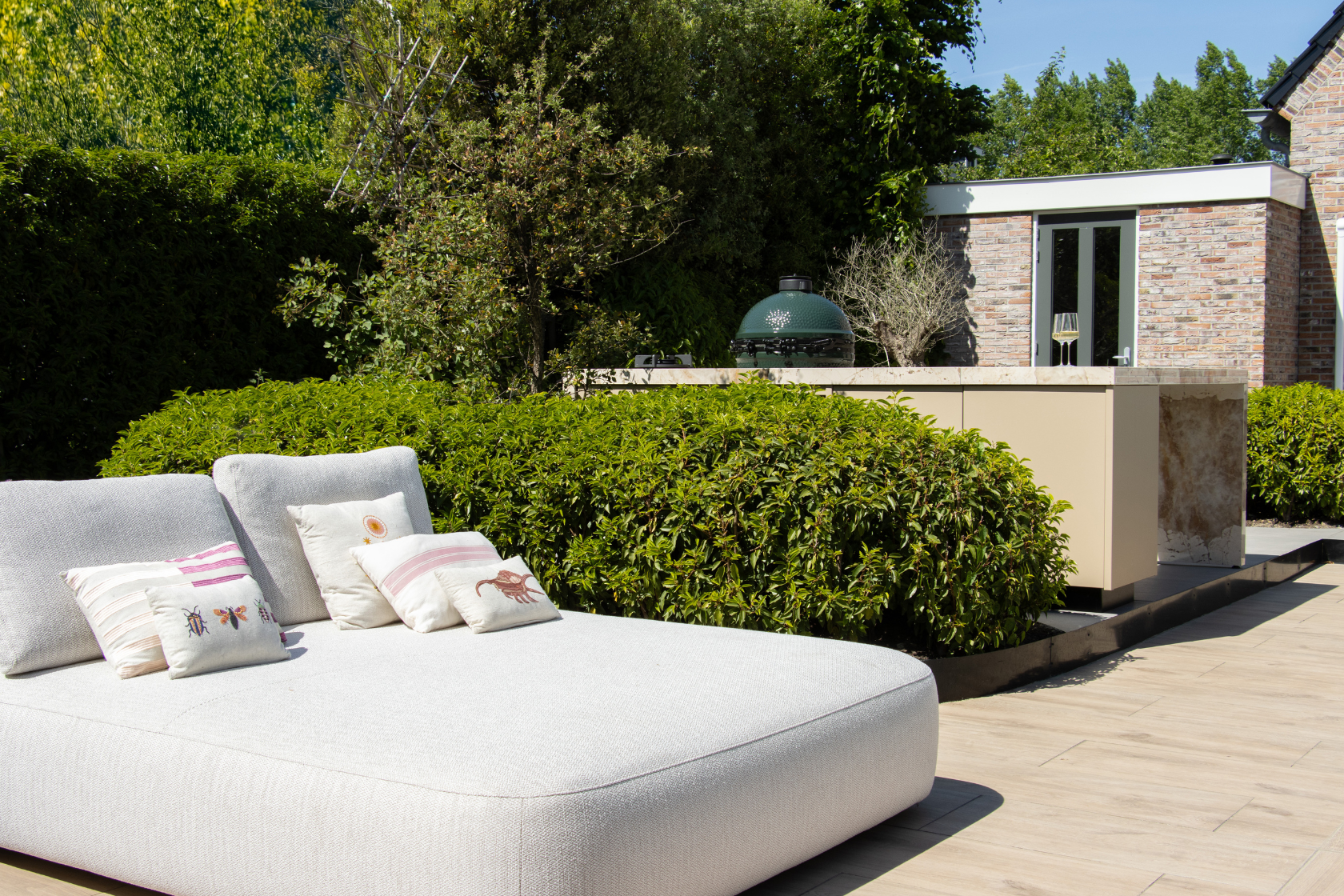 Licht, sfeervol en luxe, precies zoals Ryan en Esmee het voor zich zagen. De buitenkeuken heeft een frisse kleuren combinatie van zand, taupe en beige, afgewerkt met een zandkleurig RVS-frame dat prachtig opgaat in de rest van de tuin.