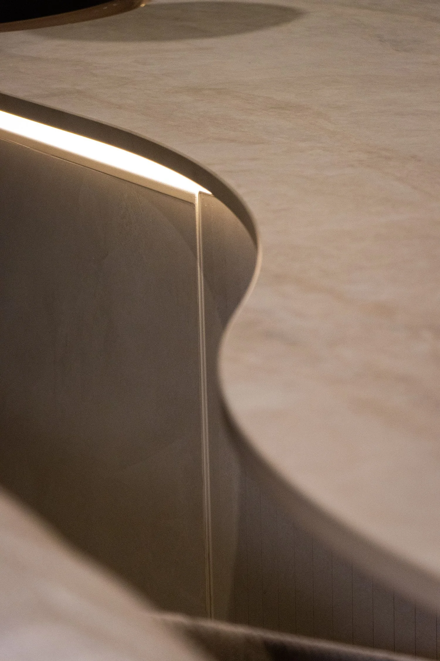 Een Fiddr gemaakt voor gedeelde momenten. Met zachte ronde lijnen, een licht kleurenpalet, een wijnkoeler, geïntegreerde verlichting, een ingebouwd geluidssysteem en een haard als middelpunt.